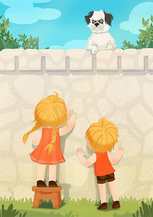 Но не тут-то было! В то же мгновение ребята услышали громкое прерывистое дыхание и почувствовали чей-то пристальный взгляд. Они одновременно обернулись в сторону соседского забора. Над ним висела круглая мохнатая голова с повисшими ушами и хмурым выражением на морде. Она пристально смотрела на детей, как будто изучая. Потом рыкнула и скрылась за оградой.