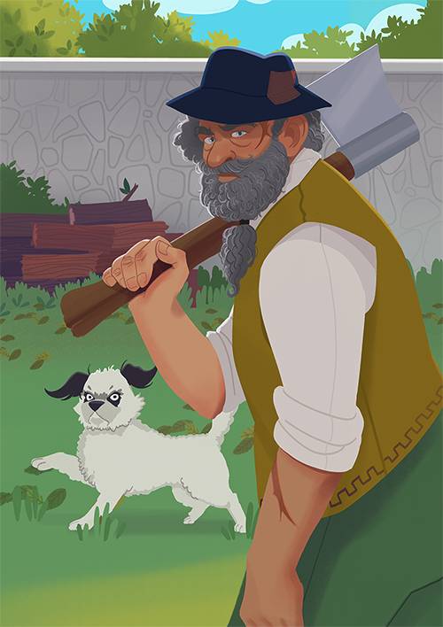 Из-под потертой коричневой шляпы выглядывали патлатые темные волосы с проседью, кирпичное лицо исполосовали морщины. Большой нос картошкой и темный ветвистый шрам на виске. А черные пронзительные глаза смотрели прямо на нее. В огромных ручищах он держал не менее огромный топор.