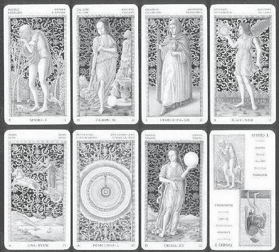К числу самых старых относится и колода Мантеньи, чье возникновение произошло в тот же период, что арканы миланского создателя карт. Она насчитывает 50 изделий без Младших арканов, поэтому профессиональные гадатели не считают правомерным причислять ее к Таро, хотя некоторые образы схожи со Старшими арканами.