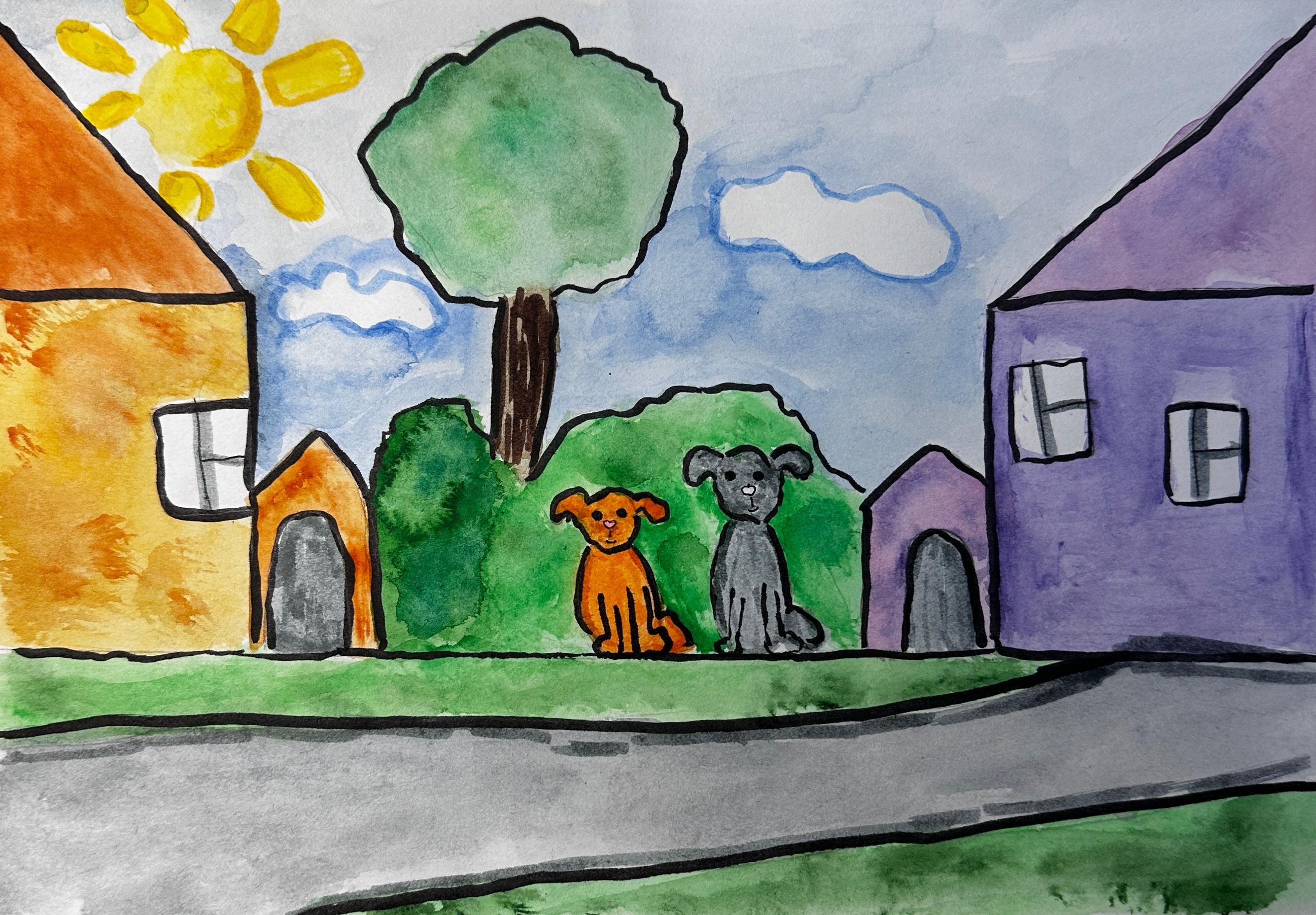 Утром сегодняшнего дня две чудесные дворовые собаки проснулись в своих будках. Да-да, вы не ослышались, в Доране было особое почитание собак и кошек и всех домашних любимцев . Жители считали долгом во дворах своих цветных домиков ставить будки для собак, причем того же цвета , что и их собственный дом. Так вот , наши две собачки-подружки явно были чем-то озадачены, они имели заговорщицкий вид. Одна из собак была достаточно высокая , почти до колен Мии доставала, светло-серая, с бандитским взглядом, хвост колечком. У этой серой собаки были смешные черные бровки, которые , как круглые островки тяжело нависали над глазами . Вторая собачка – лохматая, маленькая , рыженькая, взгляд , как у первой , хулиганский, но более трусоватый. Уши у этой собачки большие и по-смешному лопоухие, торчащие в разные стороны. Хвост короткий и пушистый.