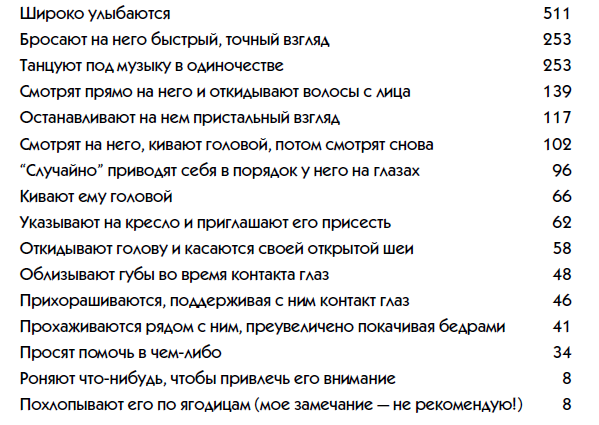 Здесь, в порядке убывания, представлены результаты изысканий Моники Мур. Число, относящееся к каждому действию, показывает количество случаев, когда, по наблюдению Мур, оно дало положительный результат во время эксперимента [21]. Нужно объяснить? Охотницы, эти действия заставляют мужчину подойти к вам на вечеринке и поговорить с вами.
