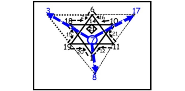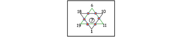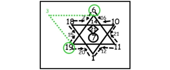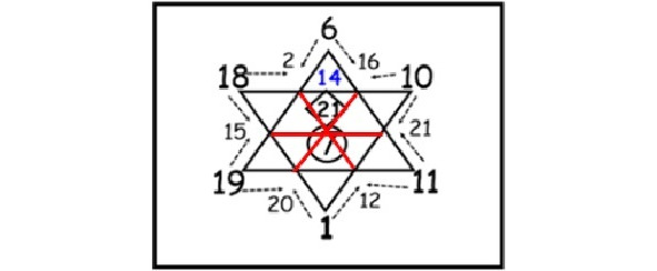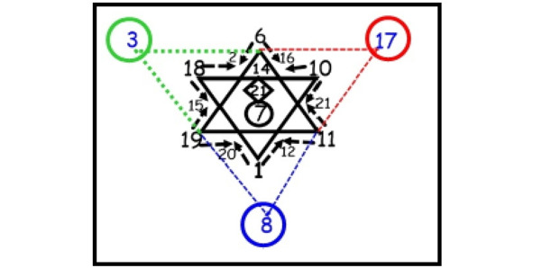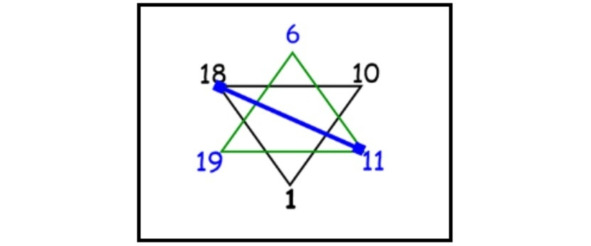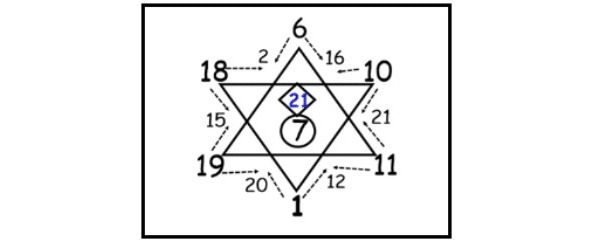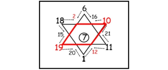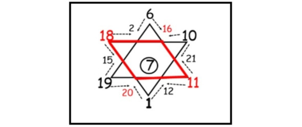 • 1 способ: Суммируем числа из противоположных углов гексаграммы.
