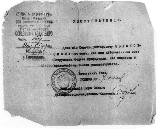Удостоверение С. В. Яблоновского, 1919