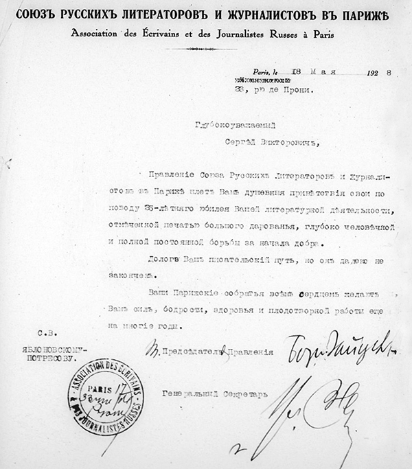 Поздравление Союза русских литераторов и журналистов в Париже, 1928
