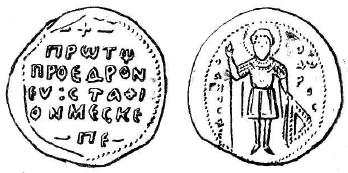 Поскольку летописное изложение собственно новгородских событий начинается только с 1113 г., сведения о первых посадниках-новгородцах извлекаются только из позднейших их перечней: «. Завид, Петрята, Костянтин, Миронег, Сава, Улеб, Гюрята, Микула, Добрыня.»[56]. Летопись сообщает о смерти последнего в этом списке – Добрыни 6 декабря 1117 г.[57] С деятельностью же Завида – связываются многочисленные свинцовые печати «протопроедра Евстафия» (рис. 11), активность которого может быть объяснена только малолетством князя Мстислава в период посадничества первого избранного главы новгородского боярства. Все девять перечисленных здесь посадников действовали в хронологических рамках княжения Мстислава Владимировича.