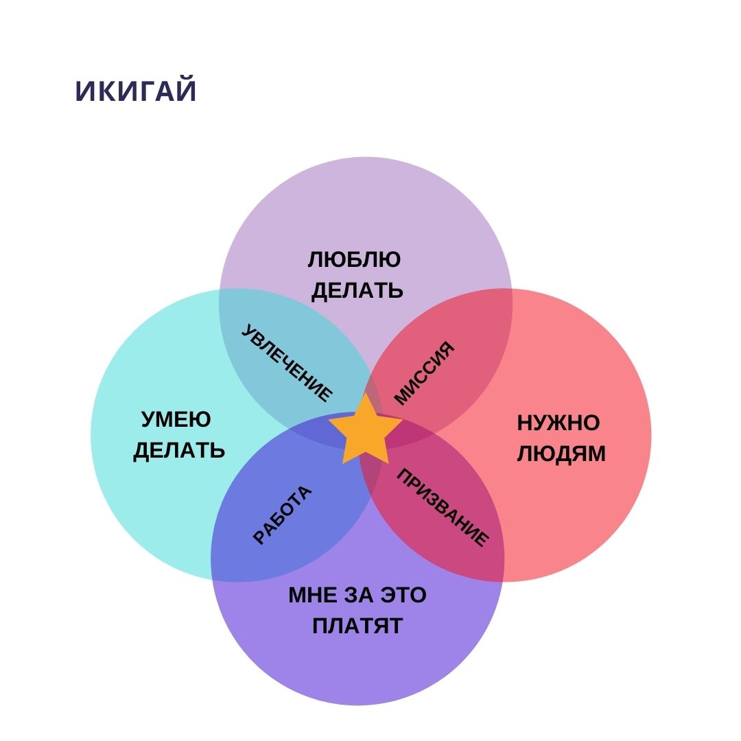 Как явно видно из диаграммы, пересечение только двух или даже трех сфер не дает такого удовлетворения, как пересечение всех четырех. Это и есть Икигай. Но как его найти? В домашних заданиях вы сможете найти упражнение, которое облегчит вам определение этого понятия.