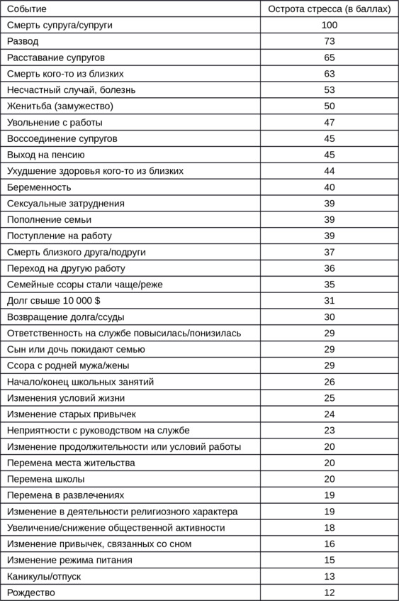 Таблица, с небольшими поправками, рассчитанными на британского читателя 80-х годов, воспроизводится по исследованию социальной адаптации Томаса Х. Хоулмза и Ричарда Х. Рейха, опубликованному в Journal of Psychosomatic Research, N 11 (Пергамон Пресс, 1967).