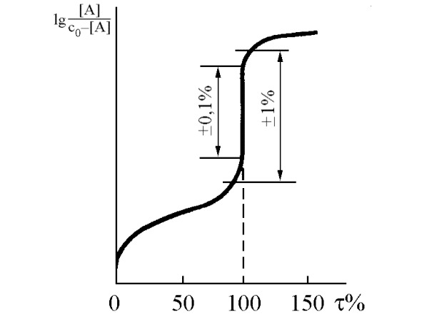 Логарифмические кривые титрования имеют две пологие ветви (рисунок 3.1), между которыми находится крутой участок, называемый скачком титрования. Величина скачка титрования определяется значением константы равновесия реакции титрования, концентрациями титранта и титруемого вещества, а также выбором точки начала и точки конца скачка титрования.