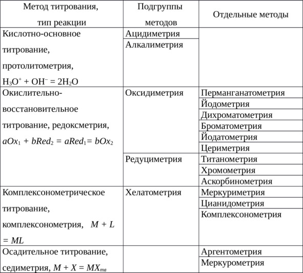 Титриметрические методы классифицируются по реакциям титрования. Отдельные титриметрические методы называются по реагентам, применяемым в этих методах (таблица 3.1).