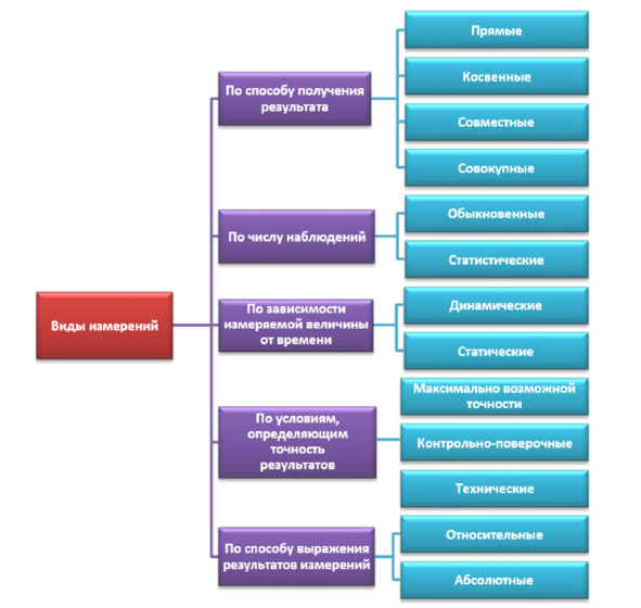 Измерения как экспериментальные процедуры определения значений измеряемых величин весьма разнообразны, что объясняется множеством измеряемых величин, различным характером их измерения во времени, различными требованиями к точности измерений и т. д. Существует несколько видов измерений.