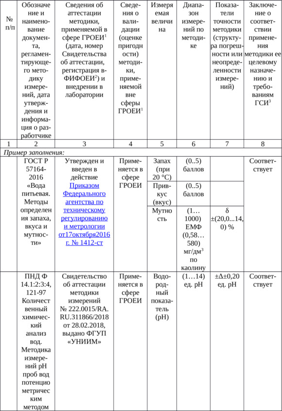 Графу 7 «показатели точности методики…» заполняются только для количественно-химического анализа и для тех измерений, которые имеют показатели точности (погрешность или неопределенность измерений).