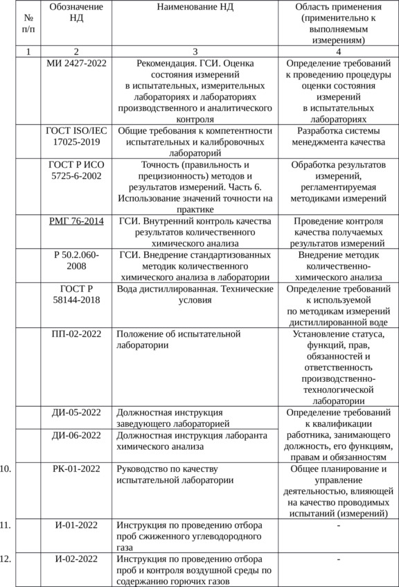 Это перечень нормативной документации (далее – НД) на методики (методы) измерений и методы испытаний (в т.ч. национальные и межгосударственные стандарты), данные о применяемых методиках (методах) измерений и методах испытаний.