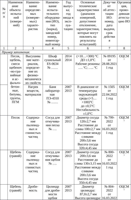 – наименование испытательного оборудования в соответствующей графе следует указывать в соответствии с сопровождающей его технической документацией;