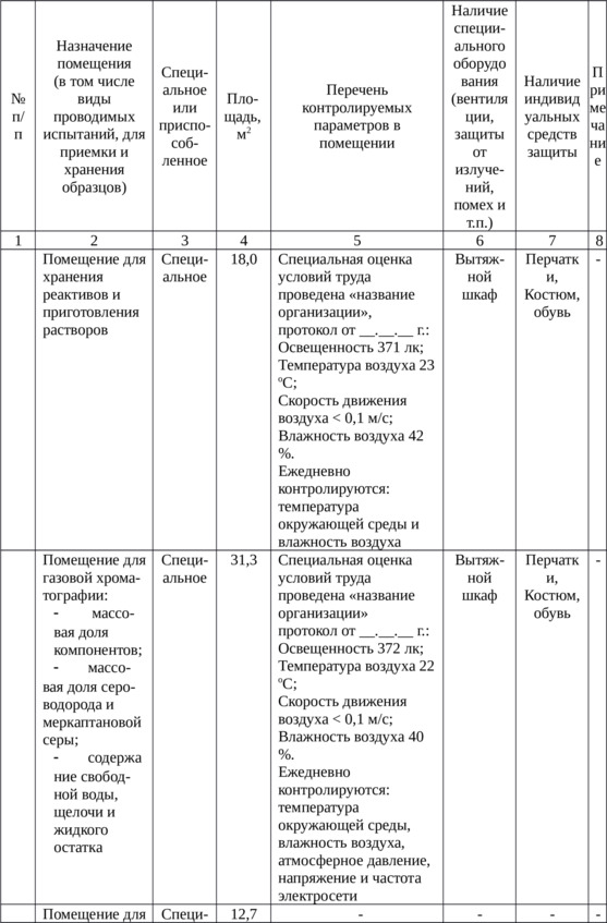 Информацию для заполнения графы 5 «перечень контролируемых параметров в помещении» следует брать из последнего протокола специальной оценки условий труда, проводимой в обязательном порядке согласно Федеральному закону «О специальной оценке условий труда» от 28.12.2013 г. №426-ФЗ. Желательно указать по каждому параметру норму и фактическое значение.
