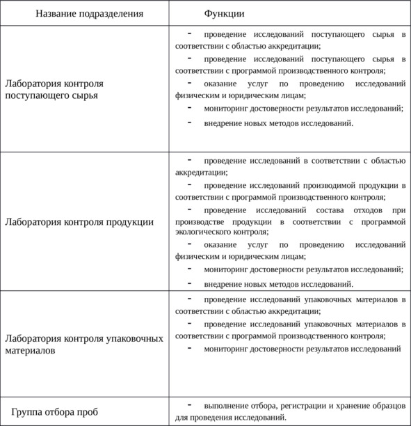 В состав [Название лаборатории] входят четыре подразделения: лаборатория контроля поступающего сырья, лаборатория контроля продукции, лаборатория контроля упаковочных материалов, группа отбора проб. Руководство данными подразделениями осуществляется руководителями, назначаемыми на должность приказом Руководителя организации.
