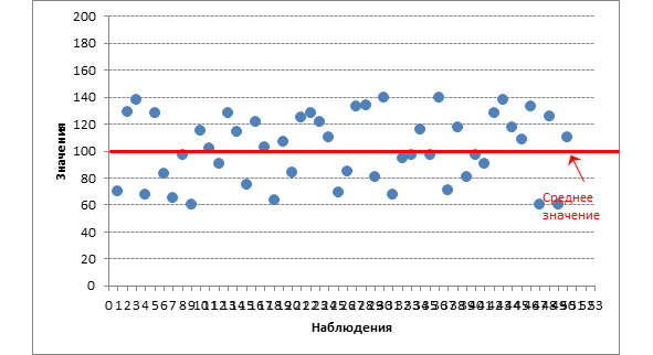 Дисперсия – это средний квадрат отклонений. То есть вначале рассчитывается среднее значение, затем берется разница между каждым исходным и средним значением, возводится в квадрат, складывается и затем делится на количество значений в данной совокупности. Разница между отдельным значением и средним арифметическим значением отражает меру отклонения. В квадрат возводится для того, чтобы все отклонения стали исключительно положительными числами и, чтобы избежать взаимоуничтожения положительных и отрицательных отклонений при их суммировании. Затем, имея квадраты отклонений, мы просто рассчитываем среднее арифметическое значение. Однако в чистом виде, как, например, средняя арифметическая, дисперсия не используется. Это скорее вспомогательный и промежуточный показатель, который необходим для других видов статистического анализа. У нее нет даже единицы измерения. Для того, чтобы использовать дисперсию, из нее извлекают квадратный корень, получается среднеквадратичное отклонение (далее – СКО).