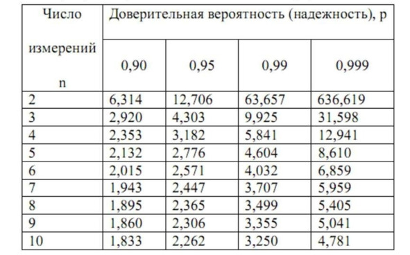 При расчете случайной погрешности задаются надежностью измерений, которую, в зависимости от целей измерений и требований к ним, принимают равной 0,9; 0,95; 0,96; 0,98; 0,99; 0,997; 0,999.