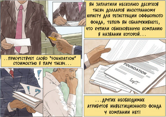 Либерализм законодателей многих оффшорных территорий в отношении тех слов, которые можно использовать в названиях компаний, может сыграть злую шутку с потребителем оффшорных услуг. Так, компания ABC Bancorp, зарегистрированная в штате Невада, так же как и компания ABC Banking House, вовсе не является ни Американской Банковской корпорацией, ни английским Банкирским домом в том смысле, который мы придаем слову БАНК. У них нет ни банковской лицензии, ни сколько-нибудь существенного оплаченного уставного капитала, ни резервного фонда. Единственным их “активом”, как правило, является пакет документов стоимостью в несколько сотен долларов.