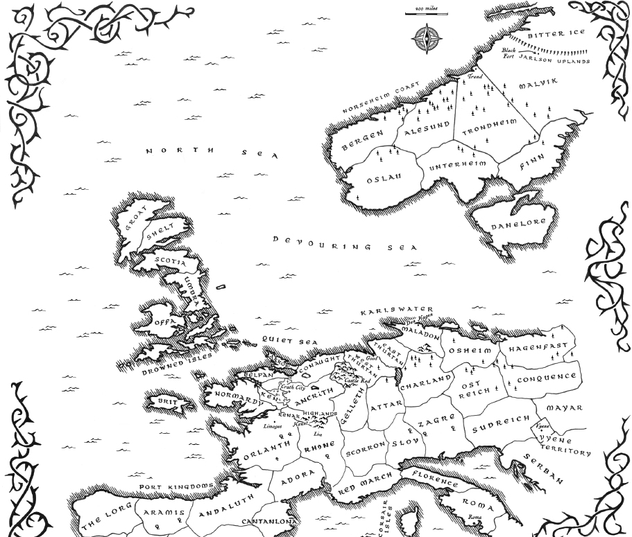 As Father’s third son I get bugger all. A chamber in Roma Hall, an unwanted commission in the Army of the North, one that didn’t even swing me a cavalry rank since the northern borders are too damn hilly for horse. Scorron deploy cavalry on the borders but Grandmother declared their pigheadedness a failing the Red March should exploit rather than a foolishness we should continue to follow. Women and war don’t mix. I’ve said it before. I should have been breaking hearts on a white charger, armoured for tourney. But no, that old witch had me crawling around the peaks trying not to get murdered by Scorron peasants.