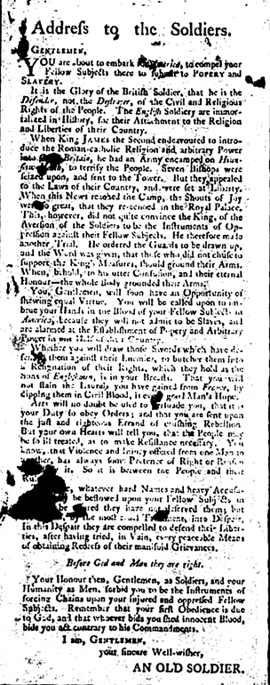 Люди, читавшие великий роман Чарльза Диккенса «Барнаби Рудж», должны знать, что в годы Американской революции в Англии велась активная антикатолическая пропаганда. В этой американской листовке тема независимости американских штатов не затрагивается, поскольку англичане были едины в непринятии этой независимости. Вместо этого авторы стремились разложить британские войска с помощью критики католицизма (оригинальный источник неизвестен; листовка хранится в архиве военного департамента. Она появилась, вероятно, в 1775 году).