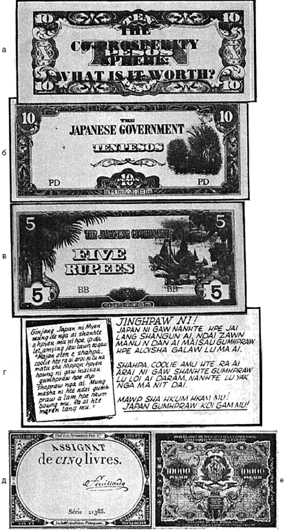 а и б – две японские купюры в 10 песо, на обратной стороне (а) имеют надписи, сделанные американцами и высмеивающие японцев; в – купюра в 5 рупий, которая имела хождение в Бирме во время японской оккупации; г – на захваченных деньгах Отдел психологической пропаганды во время Филиппинской кампании печатал свои лозунги и сбрасывал эти деньги на позиции врага; д – деньги революционной Франции. Обратите внимание на революционные лозунги на них; е – знаменитая русская купюра в 10 000 рублей с призывами к мировой революции на семи языках.