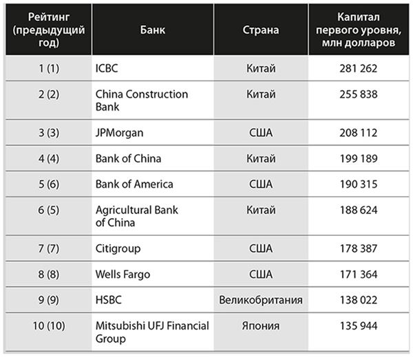 Таблица 1. Десять крупнейших мировых банков в 2017 году. Источник: издание The Banker, июль 2017 года
