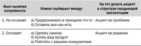 • Принципиальные различия в стиле и структуре продающей презентации кроются в ответах на два вопроса: с каким клиентом вы работаете – с существующим или с потенциальным? Клиент осознает или не осознает наличие потребности?