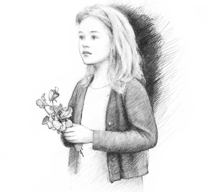 “Be a good girl and put the flowers in the vase,” she said, holding them out. Her tissue fell out of her sleeve and floated to the ground.