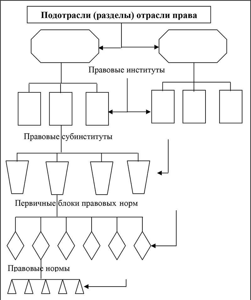 В составе общественных отношений, выступающих в качестве предмета определенной отрасли права, выделяются виды и подвиды (разновидности) отношений, которым помимо общих конструктивных признаков (элементов), обеспечивающих их однородность, присущи какие-либо специфические дополнительные признаки. Правовые нормы, отражающие дополнительные признаки видов и подвидов отраслевых отношений, группируются в подсистемы разного порядка – внутренние структурные подразделения отрасли. Другими словами, внутренняя структура отрасли, иерархия ее составных частей определяется составом однородных общественных отношений, являющихся предметом данной отрасли. Предметный признак лежит в основе внутренней структуры отрасли.