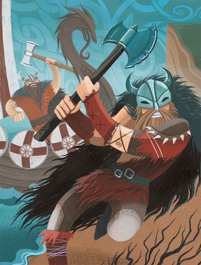 Но вот с моря раздается крик. Викинги! К берегу подплывают корабли с драконьими головами на носу и щитами по обоим бортам – драккары. В воду спрыгивают свирепые воины. Их длинные бороды завязаны в косы, а на головах рогатые шлемы. Их тела едва прикрыты звериными шкурами. А в руках у них гигантские двуручные топоры с обоюдоострым лезвием.