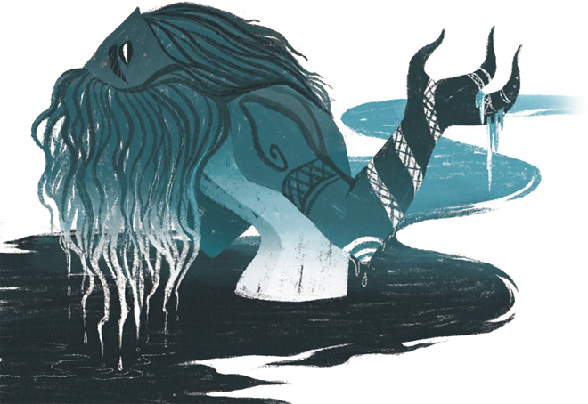 В глубинах морозной туманной обители треснули вековые льды. Гул и грохот сотрясли все вокруг. А затем из-под ледников забил родник. Он бурлил и клокотал, за что его и назвали Хвергельмир («кипящий котел»). Из глубоких разломов хлынули мощные потоки – ядовитые, смертоносные воды Эливагар («воды хаоса»), холоднее которых не было ничего на свете. Мороз Нифльхейма сковывал их, постепенно превращая в гигантские ледяные глыбы. Но даже это не могло сдержать мощь Эливагара. Все сильнее давил источник на застывшую воду, толкая ее перед собой, и все так же превращалась вода в лед. И глыбы становились все больше и больше.