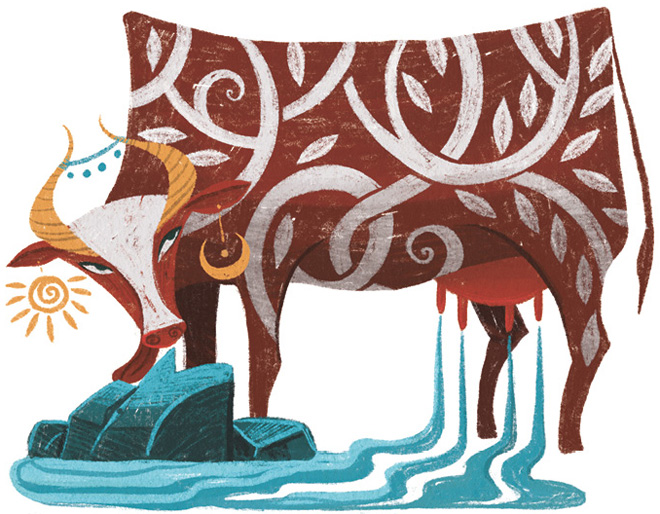 Открыв глаза, Имир огляделся. Во мраке Гиннунгагап исполин ощущал, как греет тепло огня с одного края, как дуют морозные ветры с другого и как разъедает его изнутри голод. Но вот из тающего льда появилась исполинская корова Аудумла. Когда ее тело полностью освободилось ото льда, из могучего вымени хлынули потоки молока – как четыре великие реки. Жадно присосался к вымени Имир и впервые наелся досыта.