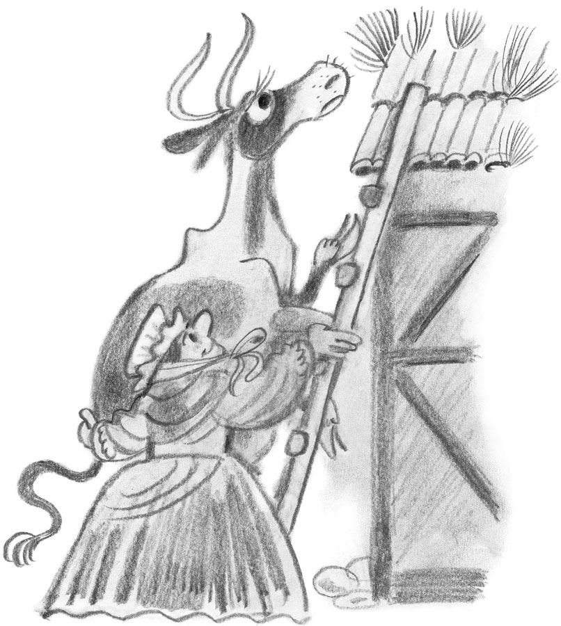 Well, he travelled a long way, and at last[55] he came to a woman’s cottage. It had some grass on the roof. And the woman was trying to get her cow to go up a ladder[56] to the grass. So the gentleman asked the woman what she was doing. “Look at all that beautiful grass,” she said, “I’m going to feed my cow with it.” “Oh, you poor silly!” said the gentleman, “you must cut the grass and throw it down[57] to the cow!”