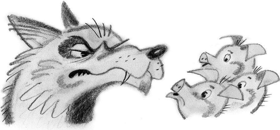 One night, the big bad wolf, who dearly loved to eat fat little piggies, came along and saw the first little pig in his new house of straw. The wolf knocked on the door and said, “Let me in, let me in, little pig, or I’ll huff and I’ll puff[85] and I’ll blow your house in![86]”