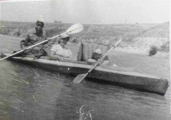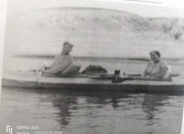 6—13 августа. Очень мешает встречный ветер. Стараемся идти до 11 утра или после 16-и. Дон стал ещё шире. Два приключения. Устроили гонки на просторе, все обошли бакен, а мы сели на камень, пропороли байдарку. Причалили, починились и погнали дальше. Но от сильной гребли сломалось у мужа металическое весло. Оно утонуло. Ребята ныряли, нашли. Идем дальше на одном весле, а я подгребаю половинкой.