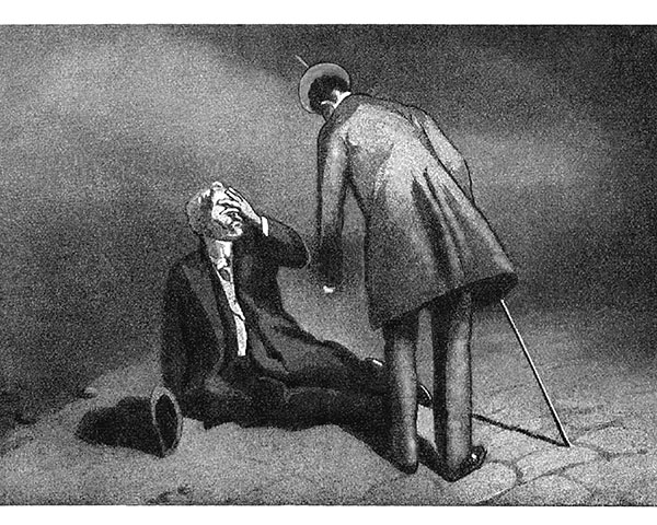 Но не успел. Человек внезапно напал на него, и тут же на безлюдном бульваре завязалась драка, борьба врукопашную, и он сразу почувствовал, что уступает в силе. Попытался звать на помощь, отбиваться, но его повалили на кучу камней, стали душить, вместо кляпа засунули в рот носовой платок. Глаза у него закрылись, в ушах гудело, он почти потерял сознание, когда внезапно хватка ослабла, человек, вцепившийся ему в горло и навалившийся всей своей тяжестью, вскочил и стал, в свою очередь, защищаться от неожиданного нападения.
