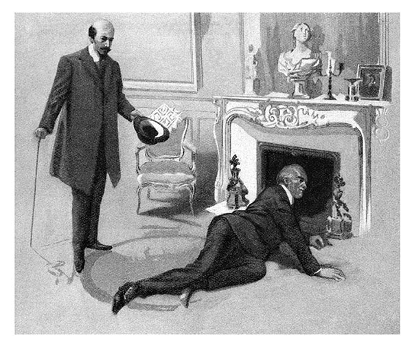 В семь часов вечера господин Дюдуи, шеф Сюрте, удивленный тем, что до сих пор у него нет никаких новостей, сам явился на улицу Клаперон. Порасспросив полицейских, охранявших здание, он поднялся к мэтру Дэтинану, который провел его к себе в спальню. Там он увидел человека, точнее, две его ноги, шевелящиеся на ковре, тогда как торс того, кому они принадлежали, засел глубоко в камине.