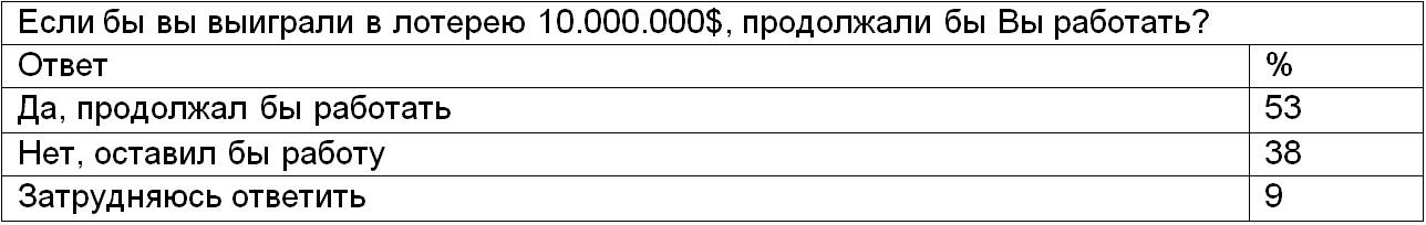 Монетаристы считают деньги естественным мотивирующим фактором. Согласно их трактовке, люди – чисто экономические существа, которые работают только для получения средств, необходимых для приобретения пищи, одежды, жилища и так далее. Однако современные теории мотивации, основанные на результатах психологических исследований, доказывают, что причины, побуждающие человека отдавать работе все силы, чрезвычайно сложны и многообразны. Во всяком случае, не только деньги служат для работника достаточной мотивацией к труду. Проиллюстрируем это результатами опроса, проведенного Всероссийским центром изучения общественного мнения (ВЦИОМ). У людей спросили: