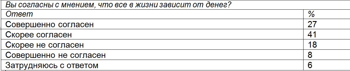 Например, на вопрос молодым россиянам: «Вы согласны или нет с мнением, что все в жизни зависит от денег?»10 были получены следующие ответы: