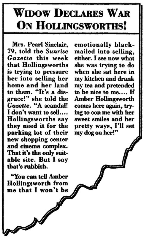 Mrs Pearl Sinclair, 79, of Sinclair Farm, Potts Road, told the Sunrise Gazette this week that Hollingsworths is trying to pressure her into selling her home and her land to them. ‘It’s a disgrace!’ she told the Gazette. ‘A scandal! I don’t want to sell. I’m a war widow. I came to live here as a new bride nearly sixty years ago. I had my son and daughter here. All my memories are here. This is my home. How can you put a price on memories? Or a home? Hollingsworths say they need it for the car park of their new shopping centre and cinema complex. That it’s the only suitable site. But I say that’s rubbish. Edward Hollingsworth owns half the coast around here. Let him build his shopping centre somewhere else. I am not going to be bullied into selling him my home!