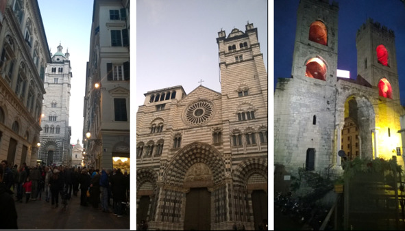 За церковью (левее) сразу же открывается большая городская площадь Феррари – Piazza de Ferrari. Но пока продолжаем движение по Via San-Lorenzo, до сохранившегося участка старых городских ворот – Porta Soprana (см. фото выше). В вечернее и ночное время ворота подсвечены попеременно разными цветами: красным, фиолетовым, жёлтым, зелёным. В Генуе сохранилось многие обширные участки старых крепостных стен IX века, XII, XIV, XVI веков и «новые стены» – XVII века (и см. выше о стенах набережной).