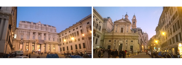 За воротами Porta Soprana располагается культурный центр – Fondazione De Ferrari, напротив него – комплекс с домом Христофора Колумба (Casa di Cristoforo Colombo). От пересекающихся здесь улиц и площади Piazza Dante, улица – Via Dante вывела нас в направлении к главной площади города – Piazza de Ferrari, упоминавшейся выше. Площадь получила своё название в 1887 году по, расположенному здесь, дому Рафаэля Феррари – герцога и мецената. Площадь Феррари объединяет собой старую Геную с её современным деловым центром. Как мы уже знаем, сюда выходят боковые фасады Palazzo Ducale и церкви Джезу. Посередине площади – величавый фонтан, с большим бассейном круглой формы, окружённый множеством маленьких фонтанных струй. Вокруг ансамбля площади располагаются следующие объекты: