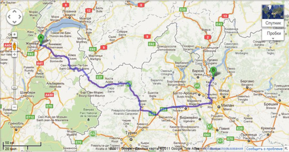 Маршрут Женева-Комо проехали за 5 часов 13 минут, получилось около 378 км пути.