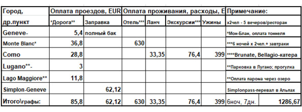 В Швейцарии на автострадах действует годовой стикер стоимостью 40 Сhf, причём транзитные автомобилисты приобретают его по такой же цене. В таблице расходов указаны: стоимость оплаты участков французских и итальянских дорог, тоннеля Мон-Блан; отеля и пр. Всего произведено необходимых затрат на сумму 1286,67 €.