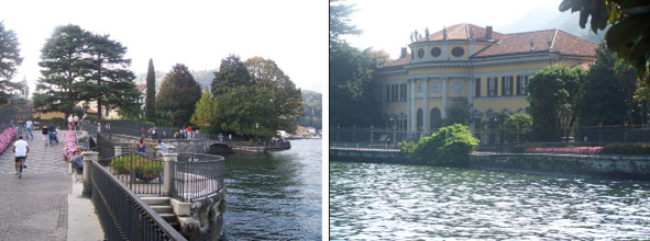 От Аэроклуба идём по пешеходным тротуарам по западному побережью (левому), любуясь старинными виллами, среди которых: villa Gallia – 1615 года, с садами и скульптурами; villa Saporiti – 1790 года, её ротонду украшают скульптуры. Виллы находятся в муниципальном или государственном владении. Приятно гулять по этой стороне озера (западной), любуясь виллами, статуями, садами; античными колоннами развалин, поросших плющом.