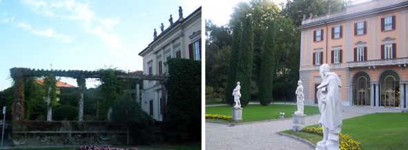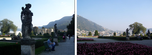 Перед виллой Ольмо разбит фонтан со сложной скульптурной композицией. До набережной озера протянулся обширный парк, гармонично украшенный статуями античных богов – на фоне цветочных клумб, ровно подстриженных кустарников и раскидистых деревьев.