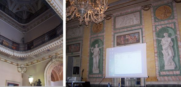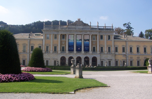 Поодаль выделяется крупное трёхэтажное строение бежевого цвета, с колоннами. Это и есть Villa Olmo (вилла Ольмо), к которой мы направляемся. Целью пребывания в Сомо является участие в Международной научной конференции, проводимой на вилле Olmo в течение всей недели. Сегодня надо пройти регистрацию и ознакомиться с ежедневным расписанием. Наш отель Park Hotel Meublé оказался удачно расположен по отношению к месту проведения конференции и ко всей набережной. С другой стороны от отеля находится исторический, старый центр города. Всё в шаговой доступности. Villa Olmo, находящаяся с 1924 года в муниципальной собственности, стала традиционным местом проведения выставок, концертов, конференций и конгрессов.