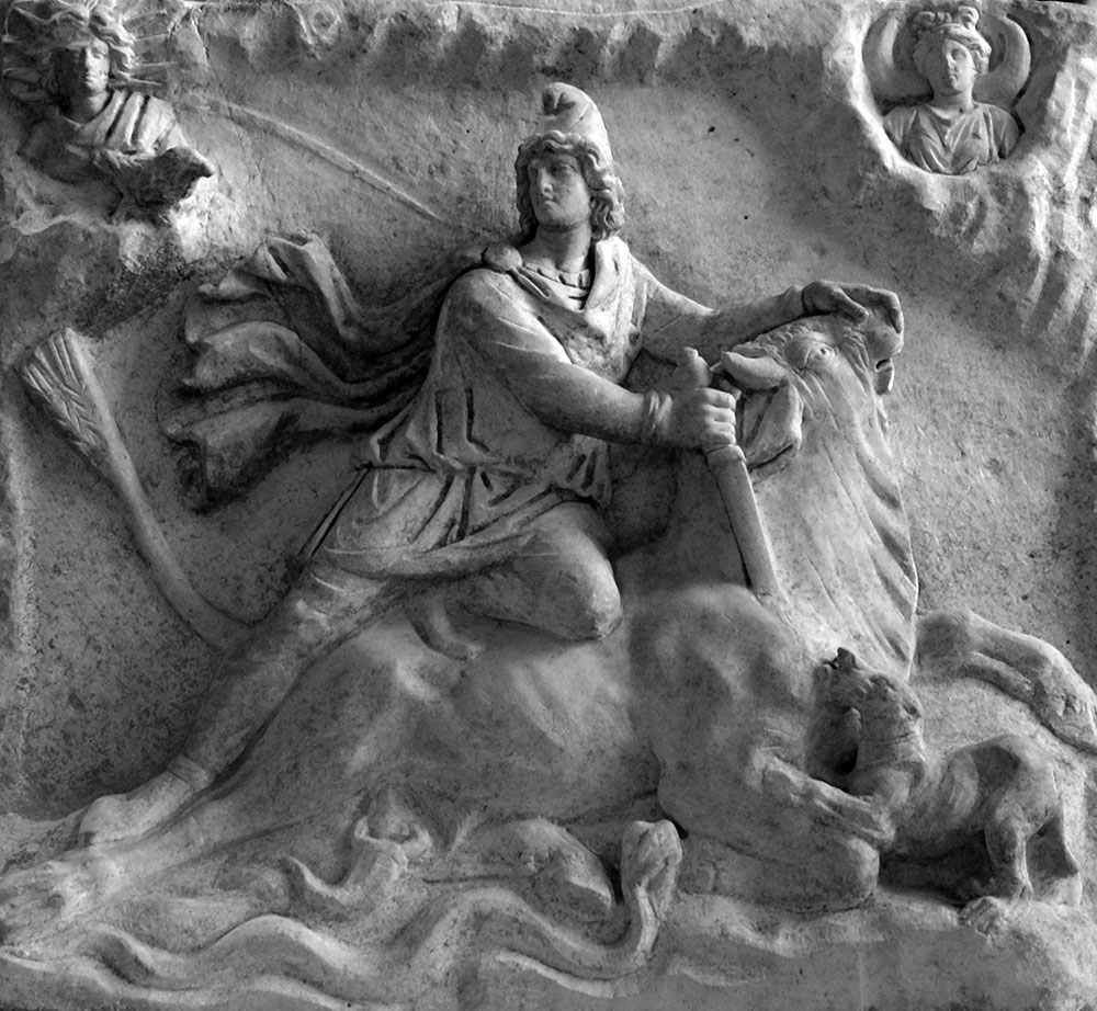 Сцена тавроктонии изображалась на центральных алтарях пещерных митреумов и была окружена символами: рядом с фигурой Митры, восседающего верхом на поверженном быке, хвост которого превращается в связку колосьев, были изображены ворон, пес, змея, скорпион, пытающийся ужалить бога, а иногда еще лев и чаша. Ученые предполагают, что они могут обозначать созвездия Ворона, Малого Пса, Гидры, Скорпиона, Льва и Чаши. В таком случае Бык может символизировать созвездие Тельца, а над этим созвездием на небе находится Персей. Значит, Митра в этой сцене соответствует древнегреческому герою Персею, тому самому победителю Медузы Горгоны. И это очень интересно, потому что старшим сыном Персея и спасенной им Андромеды был Перс, а его греки считали родоначальником персидского народа. Перс в свою очередь был отцом легендарного Ахемена, от которого вела свою родословную иранская династия Ахеменидов. Нужно еще добавить, что в Киликии, где возник митраизм, Персея когда-то почитали как бога, и вполне вероятно, что образ Митры также слился с ним в единое целое.