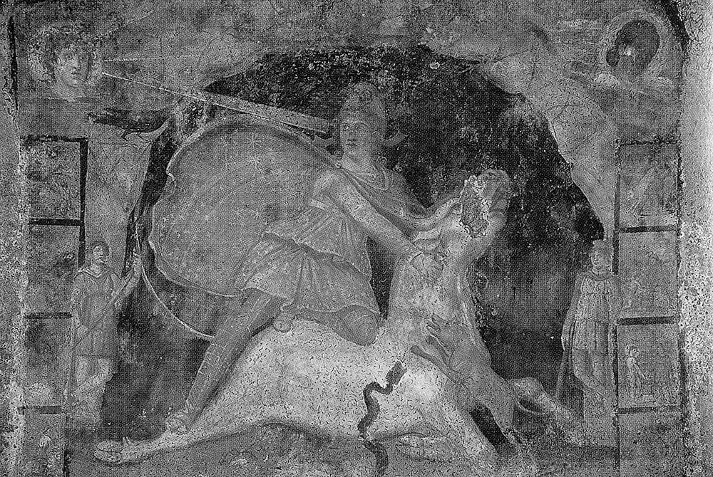 «Митра и бык».III в.н. э.Фреска из митреума в Марино.Италия