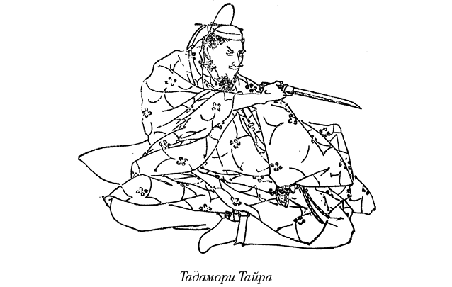 Еще в бытность правителем земли Бидзэн, Тадамори, во исполнение монаршей воли государя-инока Тобы[15], воздвиг храм Токутёдзю – храм Долголетия – длиной в тридцать три кэн[16] и поместил там тысячу и одно изваяние Будды. Храм сей освятили в тринадцатый день третьей луны 1-го года Тэнсё. В награду государь-инок обещал Тадамори пожаловать землю, где должность правителя оставалась свободной, и в самом деле даровал ему край Тадзима, где в ту пору должность эта как раз пустовала. Но так велика была радость государя, что сверх того он пожаловал Тадамори право являться ко двору. Так впервые удостоился Тадамори этого почетного права, хотя было ему в ту пору уже тридцать шесть лет. И все же придворные завидовали его успеху и сговорились напасть на него во время праздника Изобилия[17], который, как обычно, предстояло отметить во дворце в день Дракона – двадцать третий день одиннадцатой луны того же года. Тадамори проведал об этом замысле. «Я не ученый царедворец, – подумал он. – Мой род – род храбрых воинов, и было бы обидно подвергнуться унижению. Я покрыл бы позором не только себя, но и всех моих родичей! Недаром говорится: „Храни честь и тем послужишь государю!“» – и с этой мыслью он заранее принял меры предосторожности. Отправляясь во дворец, спрятал он под парадной одеждой короткий, но широкий меч; когда же все приглашенные собрались, он медленно вытащил меч и, приложив его к щеке, застыл неподвижно; в свете тускло горевших светильников, как лед, сверкало лезвие меча, прижатое к черной его бороде. Все, бывшие при этом, уставились на Тадамори, невольно вздрогнув от страха.